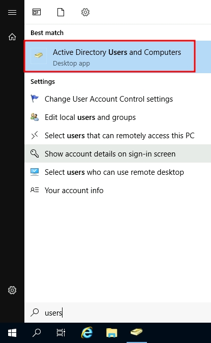 To configure users, groups or machines in Active Directory, we need to log in to the Domain Controller and run "Active Directory Users and Computers" from the start menu: