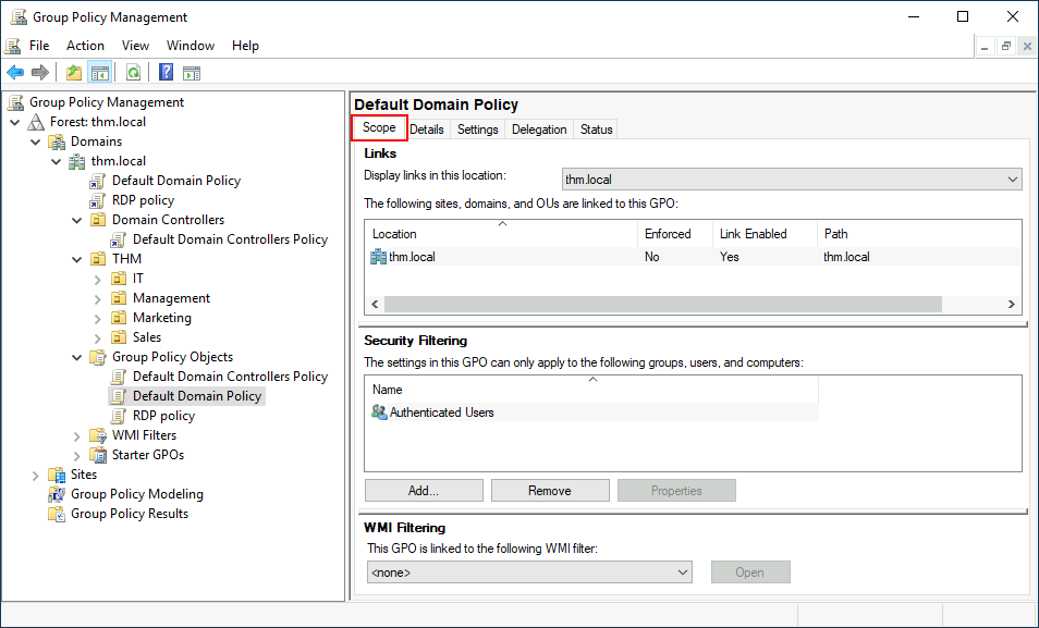 Let's examine the Default Domain Policy to see what's inside a GPO. The first tab you'll see when selecting a GPO shows its scope, which is where the GPO is linked in the AD. For the current policy, we can see that it has only been linked to the thm.local domain: