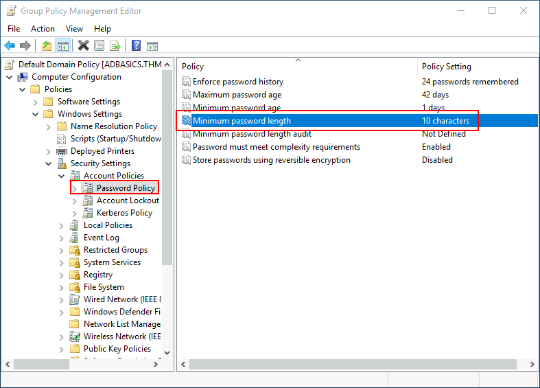 This will open a new window where we can navigate and edit all the available configurations. To change the minimum password length, go to Computer Configurations -> Policies -> Windows Setting -> Security Settings -> Account Policies -> Password Policy and change the required policy value: