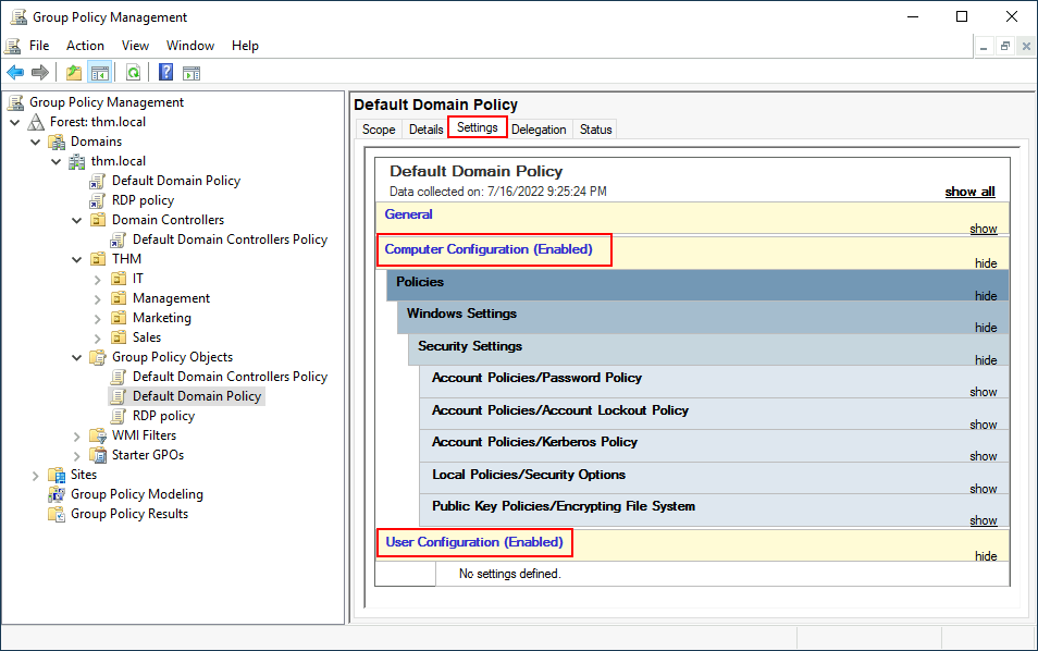 We can see in the image above that 3 GPOs have been created. From those, the Default Domain Policy and RDP Policy are linked to the thm.local domain as a whole, and the Default Domain Controllers Policy is linked to the Domain Controllers OU only. Something important to have in mind is that any GPO will apply to the linked OU and any sub-OUs under it. For example, the Sales OU will still be affected by the Default Domain Policy.